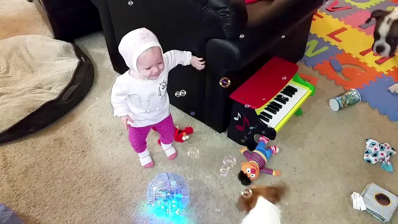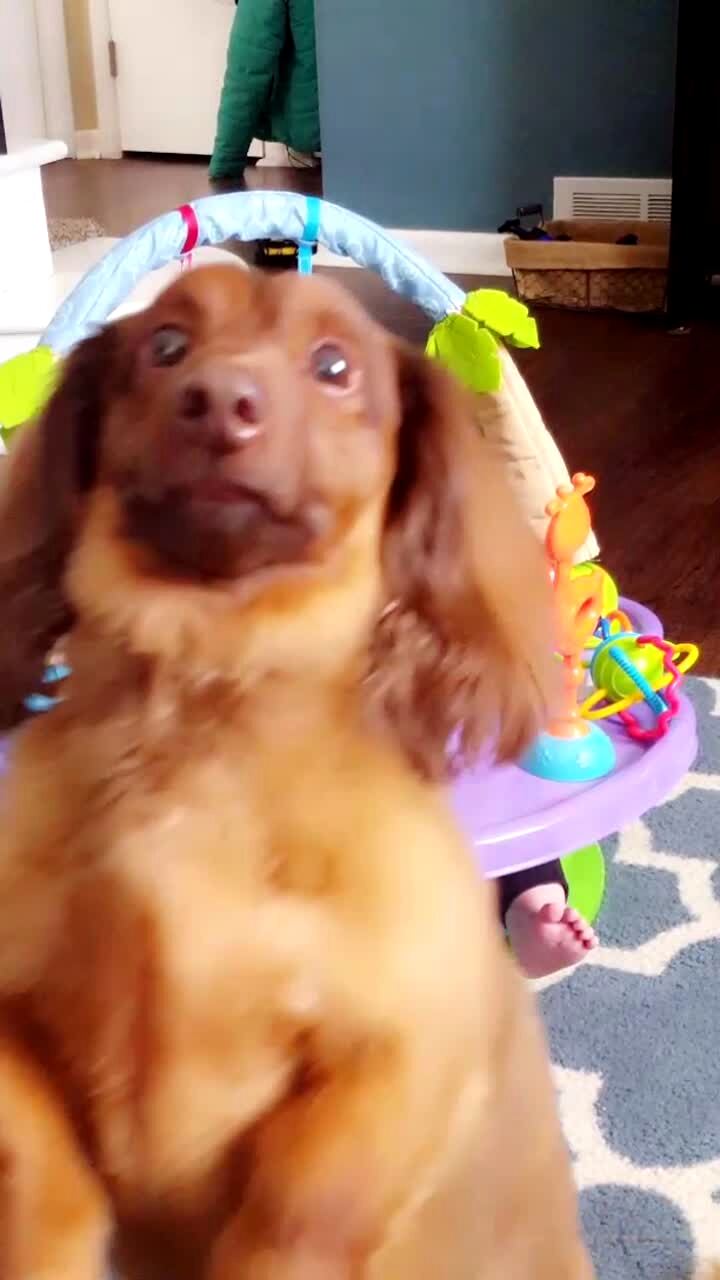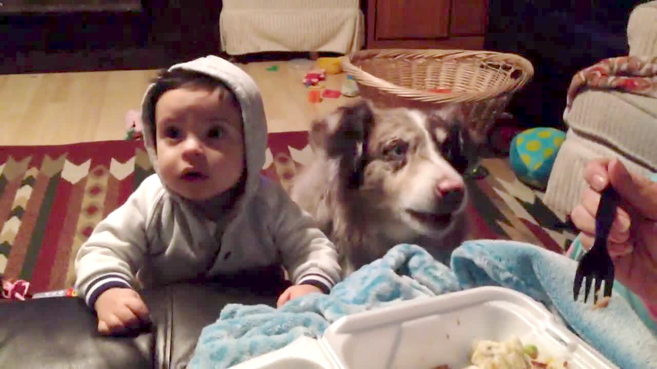 A mom tries to get her baby to say "mama." The baby doesn't say a word, but the dog sitting next to it says it multiple times.