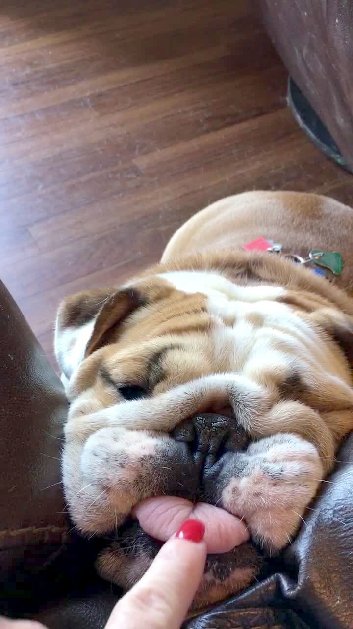 A dog sticks its tongue out each time a woman pushes it back in the dog's mouth.