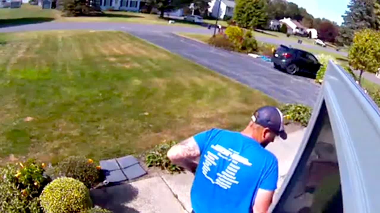 A man climbs down a ladder on a porch. He carries the ladder off the porch and falls down on the steps. Security camera footage.