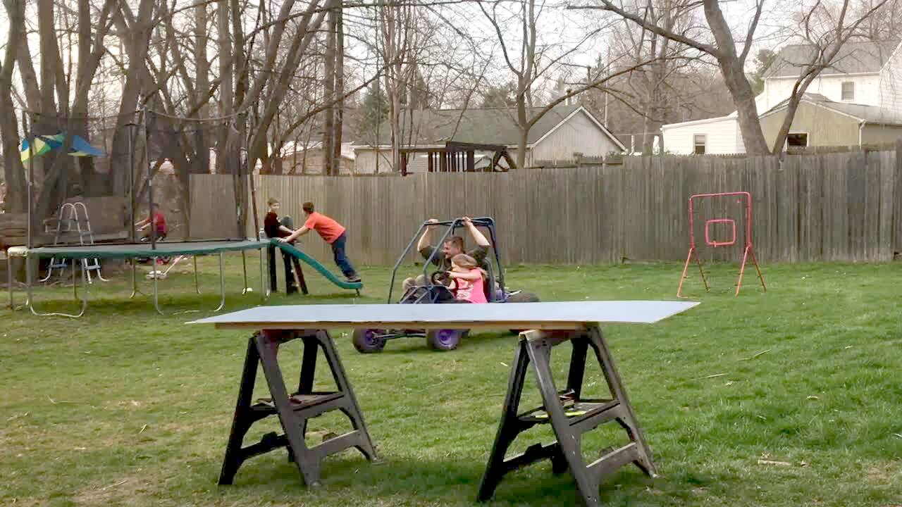 A young girl drives her father around a yard on a go cart until they crash into a sawhorse. Short tail. Table.