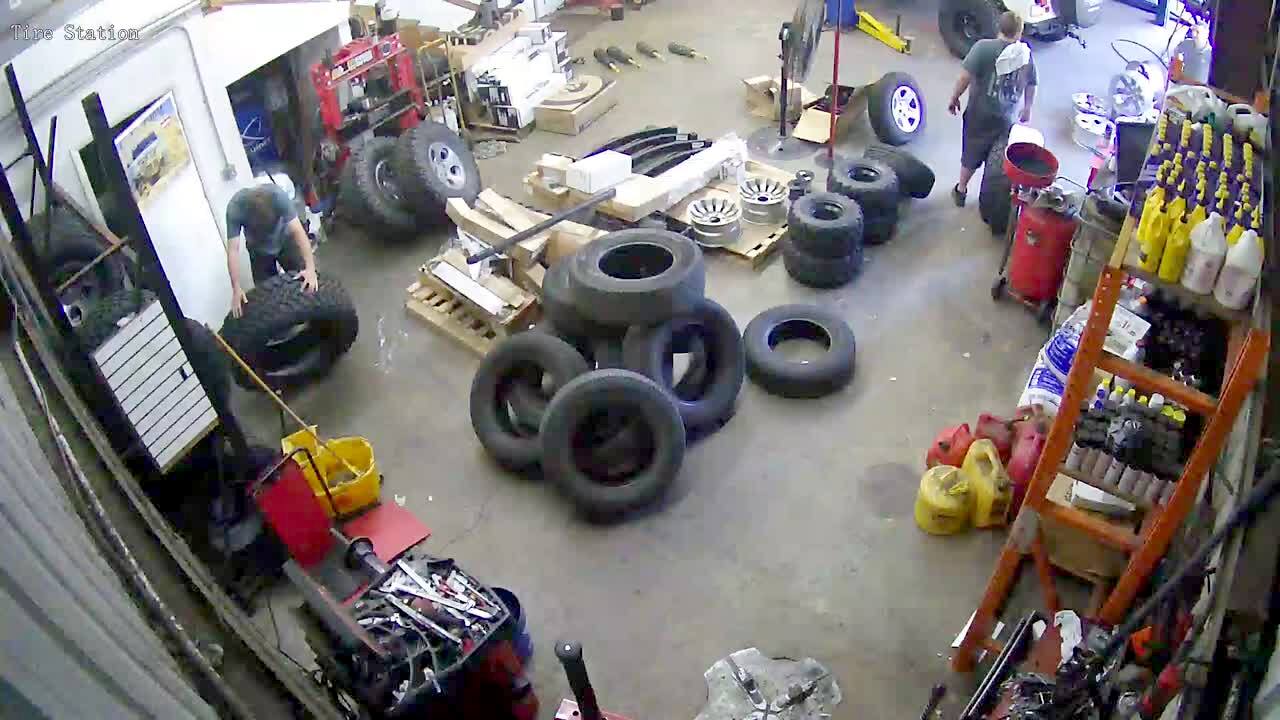 A man in a garage lifts a large tire. He drops the tire over his head and he falls down under the weight of the tire. No audio.