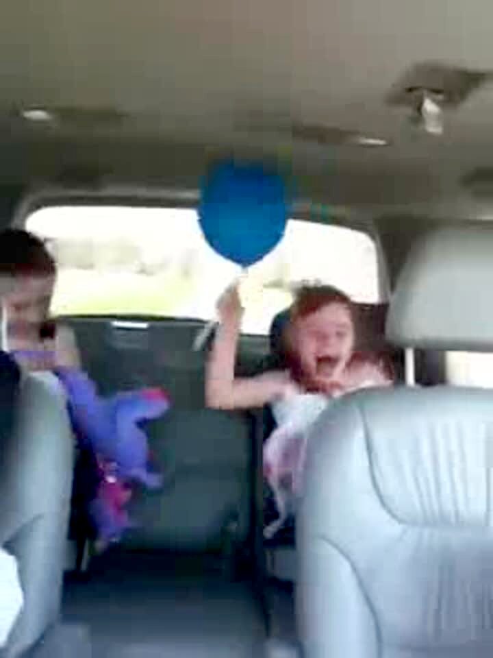 A young girl waves a balloon on a stick in a car. The balloon comes off the stick and goes behind the girl. The girl cries until she gets her balloon back and it immediately goes out the car window and the girl cries again.