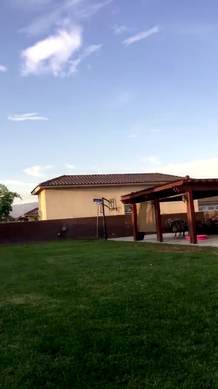 A girl jumps on a trampoline in the yard outdoors and it breaks under her and she falls through. Short tail