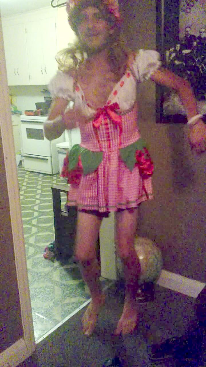 A man wears a Strawberry Short Cake Halloween costume and dances indoors before he loses his balance and falls over.