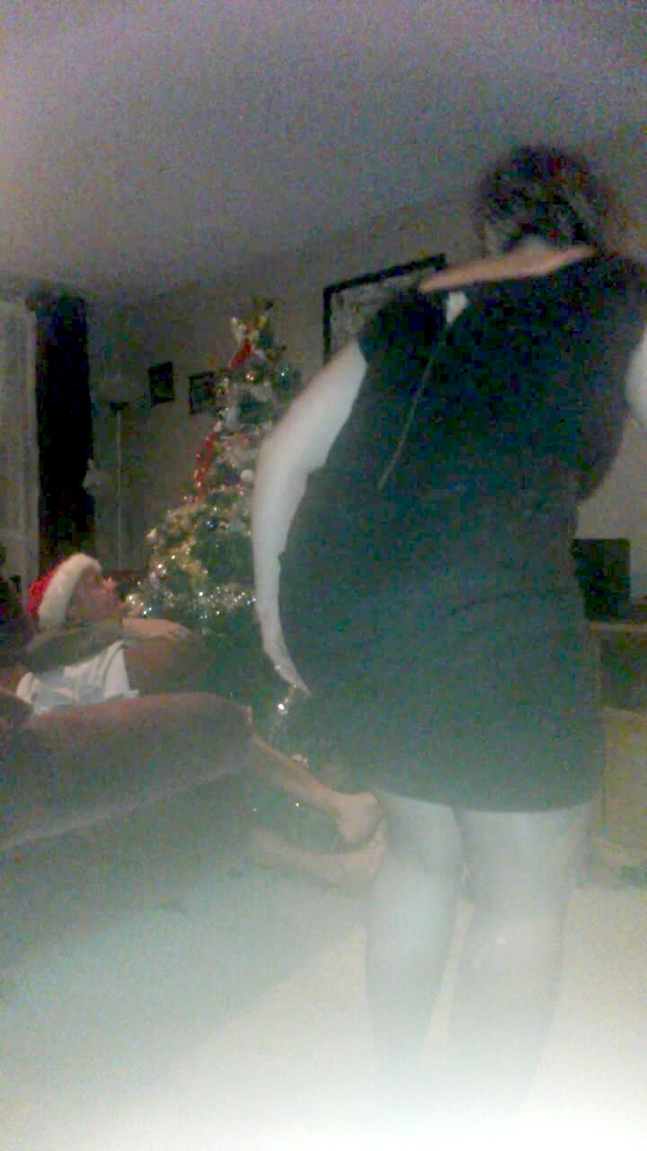 X-mas; Christmas Dance. Couple dance, man falls against tree.