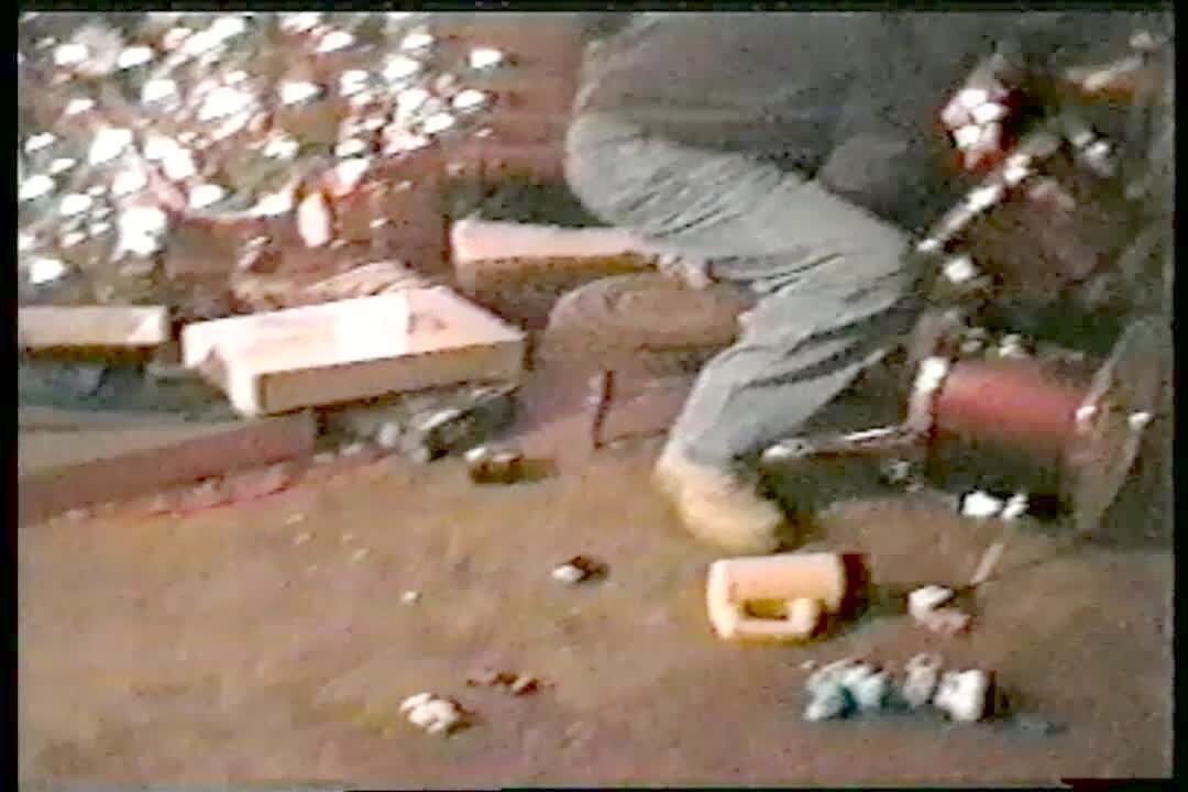 An adult man dances to music on a picnic table and falls through the table and destroys it outdoors.