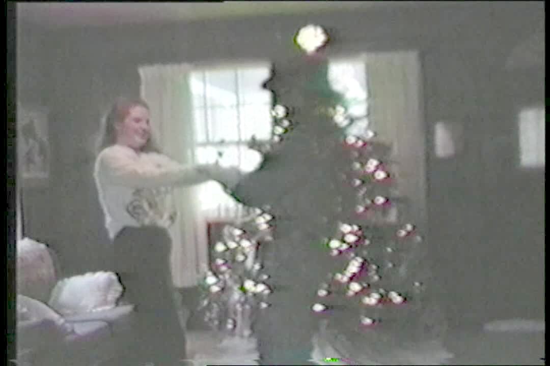 A man falls into a Christmas tree then knocks it over when he walks onto the front porch. Security footage.