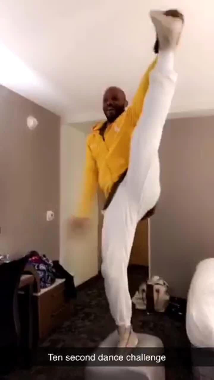 A man dances along to a song and falls backwards into a dining chair in a living room. Music rights not cleared.