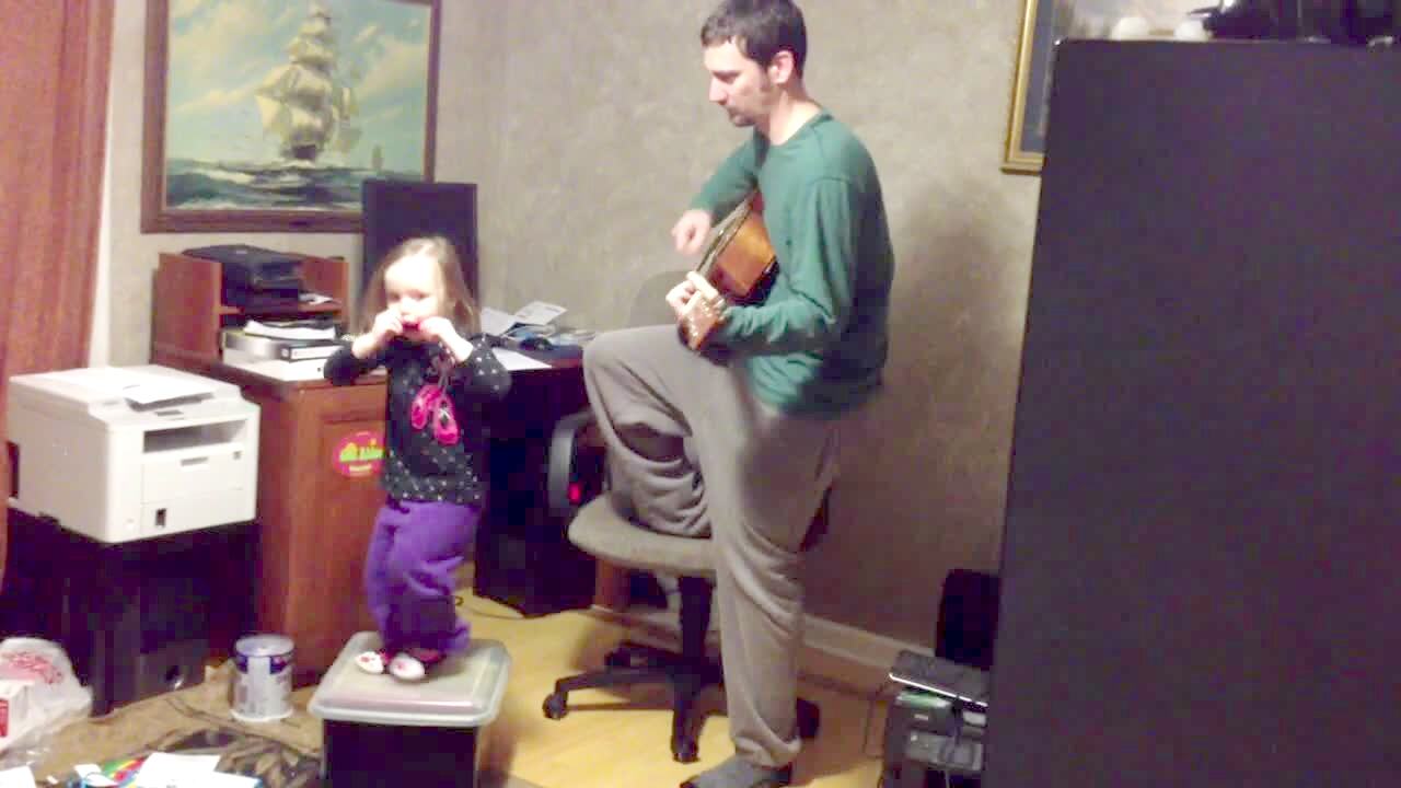 A man and a little girl dance and play guitar and harmonica before the girl falls off a box. Short tail.