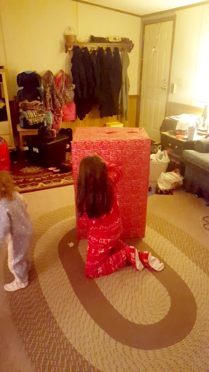 A young girl and her tot sister open a large box for Christmas before their grandma pops out of the box and falls over.