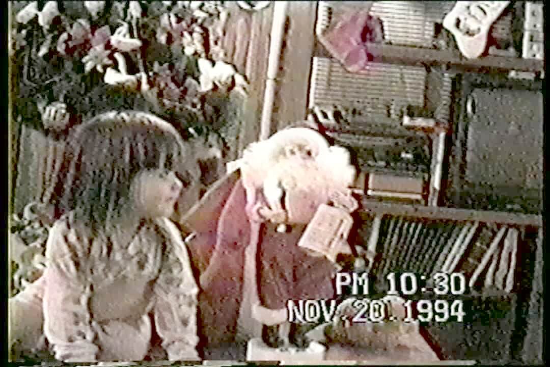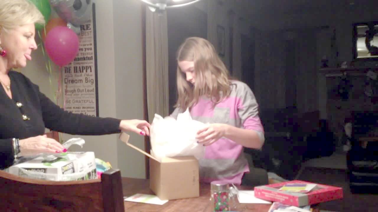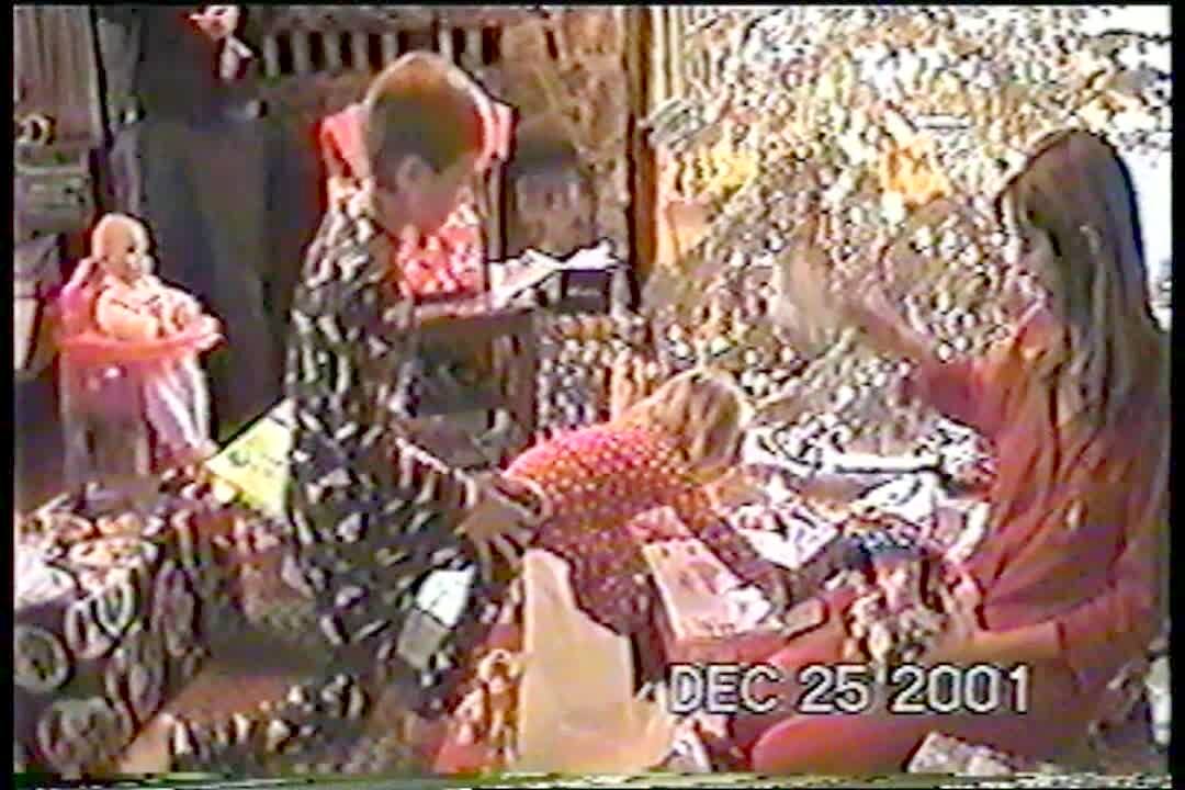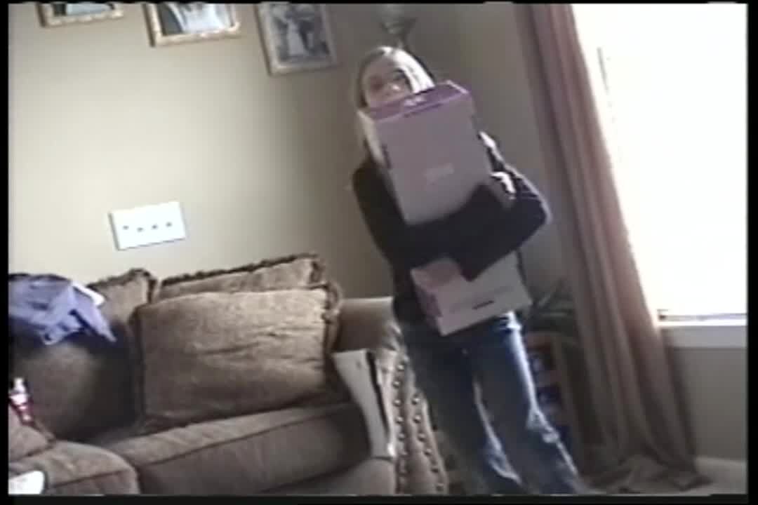 Girl at Christmas opens and gift screams. She holds the box and spins in circles, then falls into a small glass table. She cries and yells to stop taping.