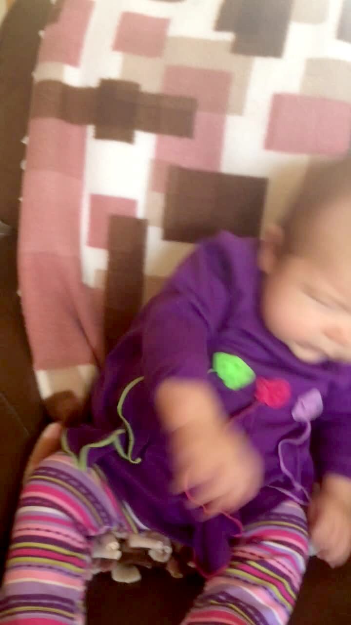 A baby girl cries in a living room. Her uncle puts a blanket over her, and she stops, but she starts again each time he moves the blanket.
