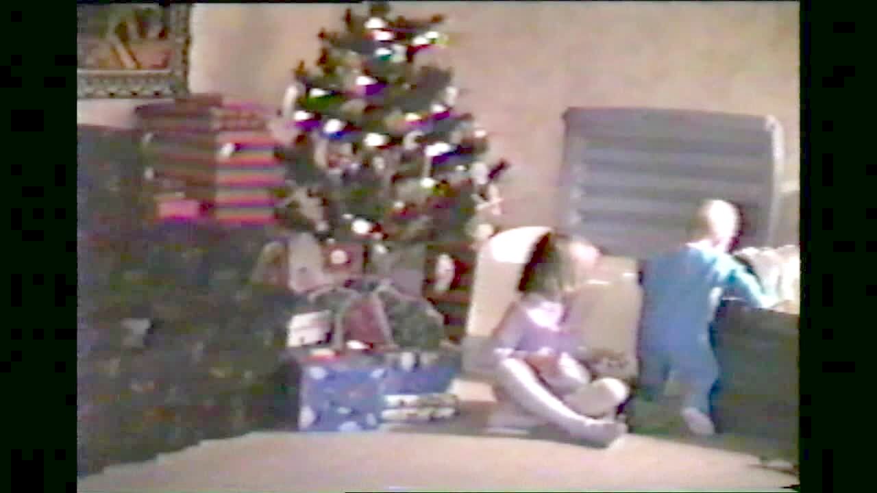 Tot girl gets Christmas present. Its a baby doll that cries. She tries to lay it in the crib so it stops crying. She gets upset and kicks the crib when the baby doesn't stop crying.