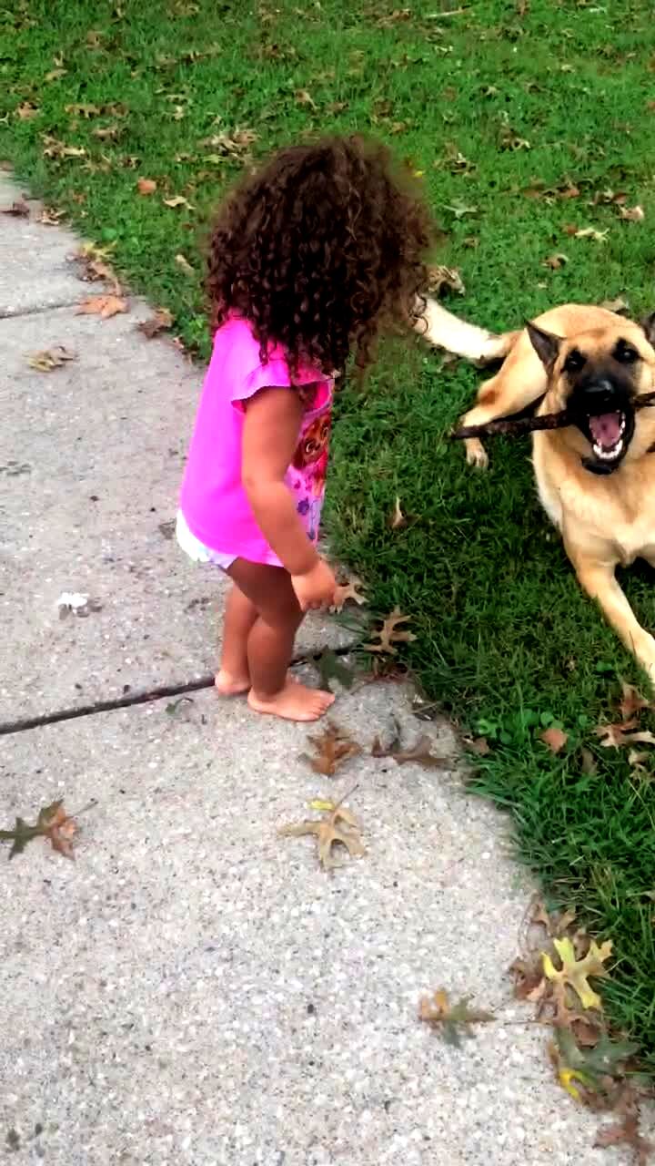 A Bulldog dog chews on a stuffed toy with a mannequin head behind him. A woman clears her throat, and the dog turns and sees the head and runs away. Prank