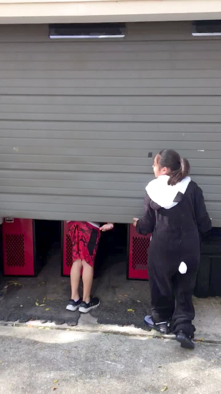 A woman opens an SUV trunk and thousands of golf-balls pour out and bounce and roll down the driveway.