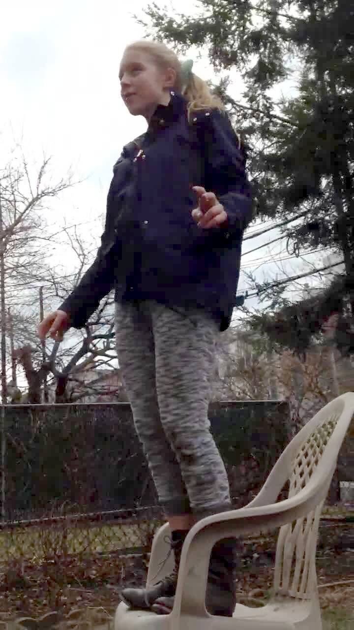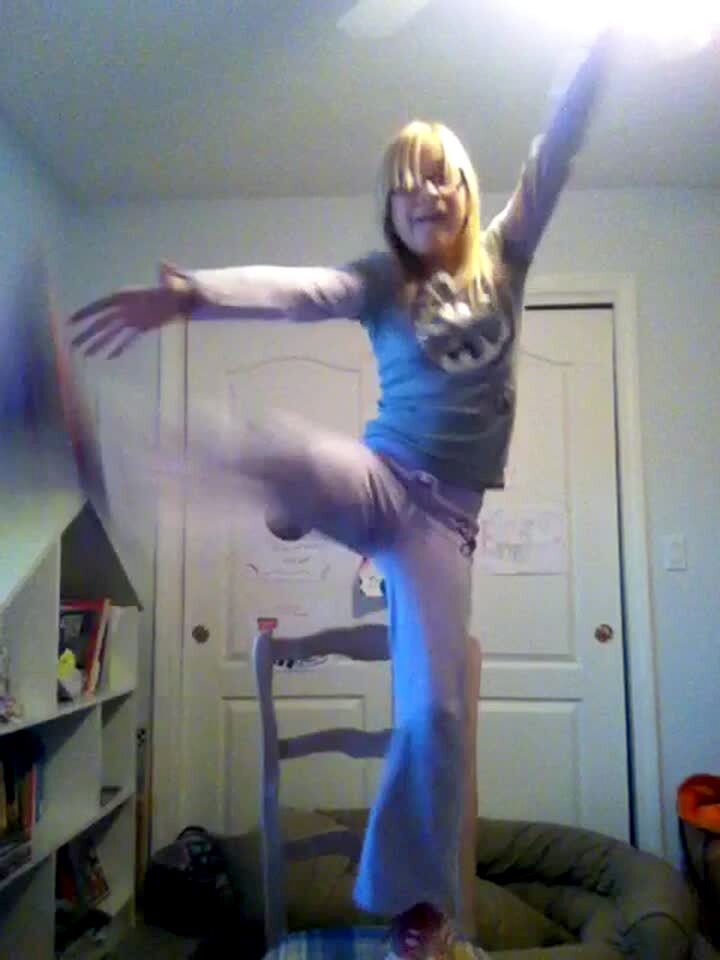Girl dances, cheerleads on chair in bedroom, chair tips over and girl falls on floor hard, brother comes in and asks, "Are you unconscious?"
