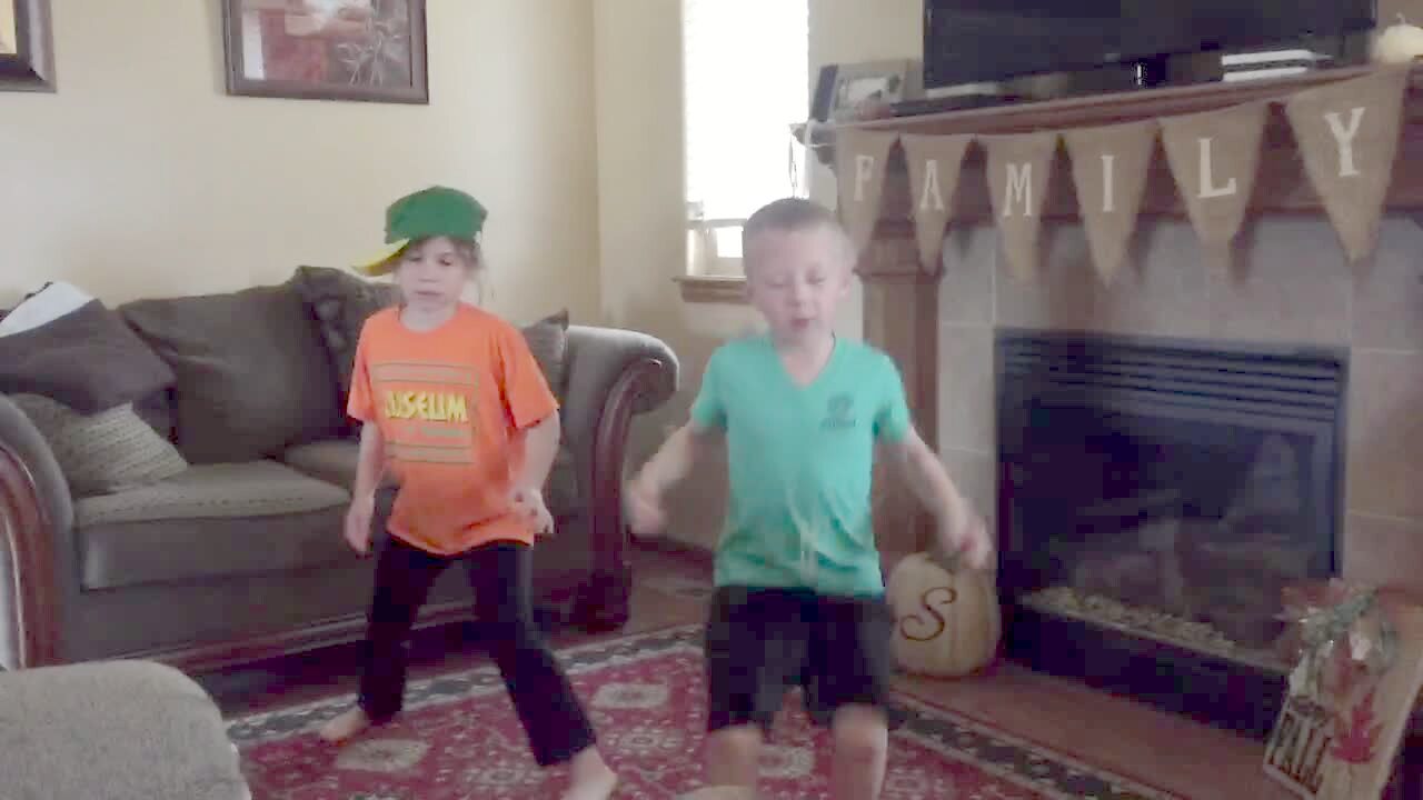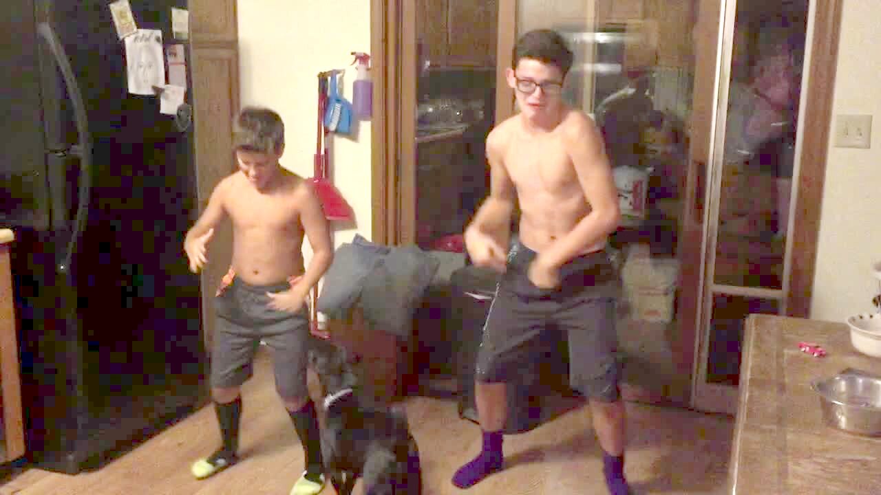 Two young boys dance along with a song. The taller boy accidentally kicks his brother in the face.