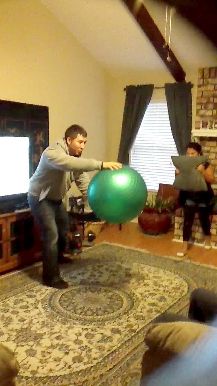 A teen boy holds an exercise ball out for his brothers to run into indoors. He lifts it up and they crash into each other. Practical jokes.