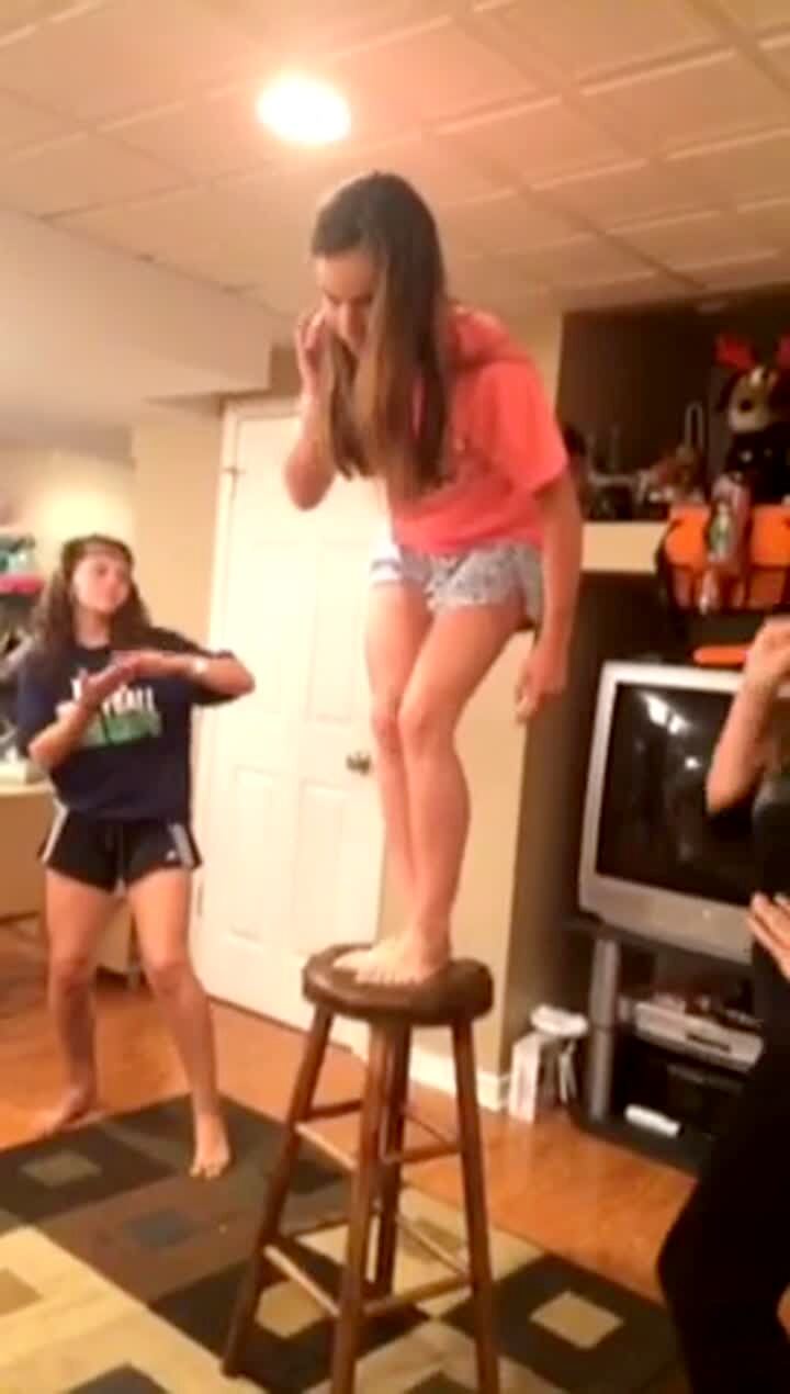 A teenage girl falls to the floor standing on a kitchen stool trying to dance with friends.