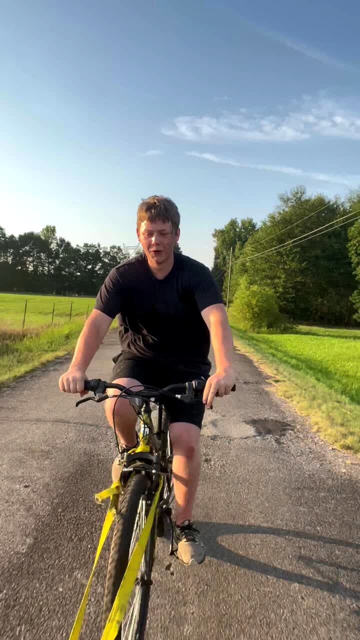 A teen boy rides a bicycle attached to a vehicle that drives on a road. The boy on the bicycle falls over.