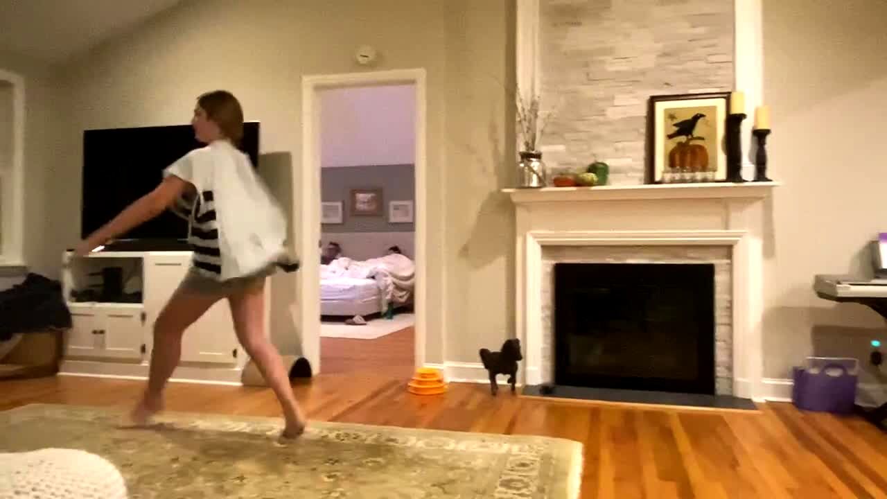 A young girl dances in the living room. Her brother suddenly falls off a couch and kicks her in the face and they both fall. Music rights not cleared.