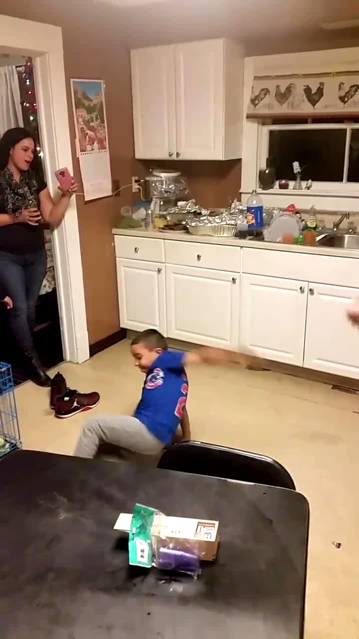 A man dances with a tot boy in the living room and accidentally bumps into a young boy with his butt and knocks him down. Music rights not cleared.