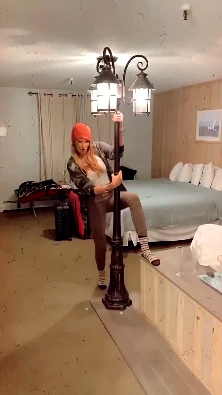 A woman pole dances on a lamp post in a hotel room, and then it breaks and she falls on the floor as the glass shatters.