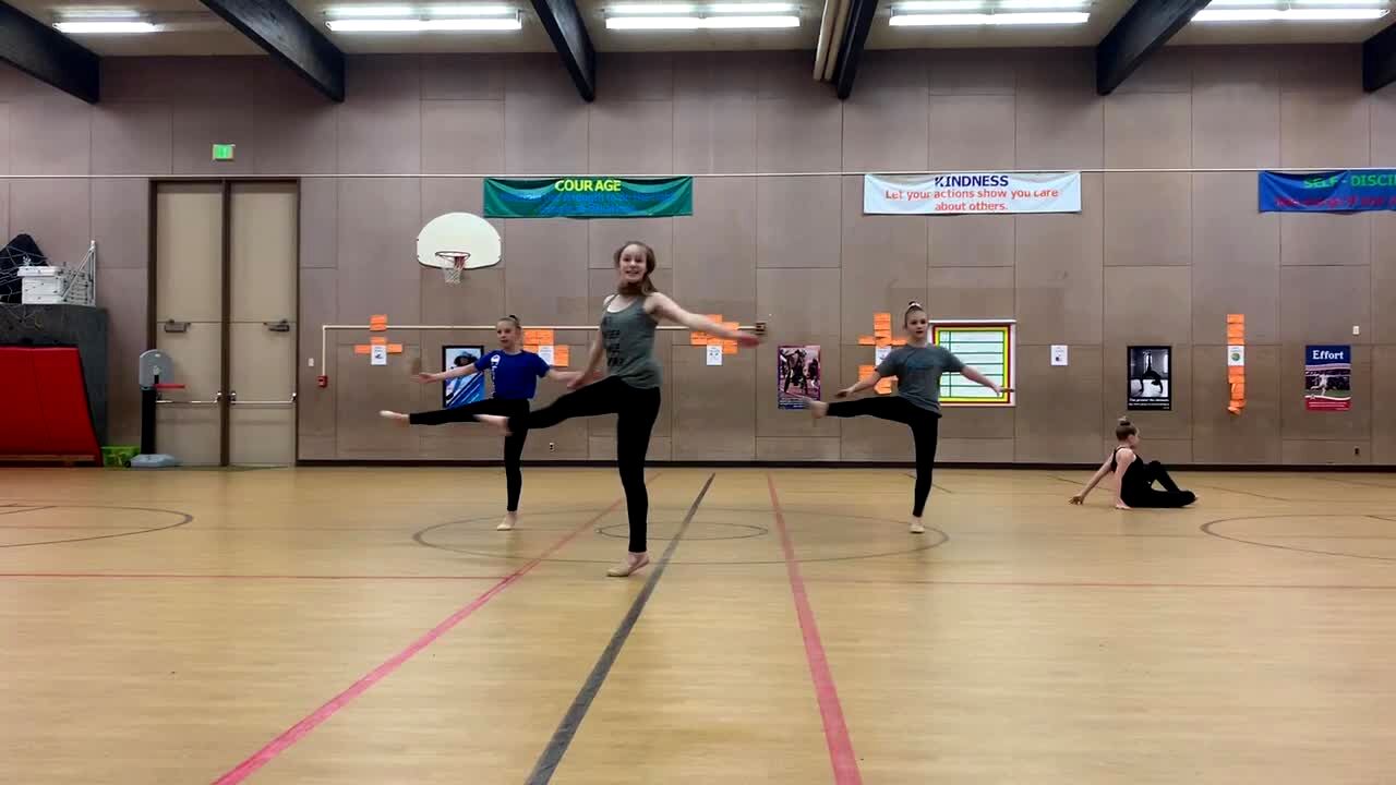 A group of teens practice a dance routine in a gymnasium and one of them slips and falls to the floor during a leg kick.
