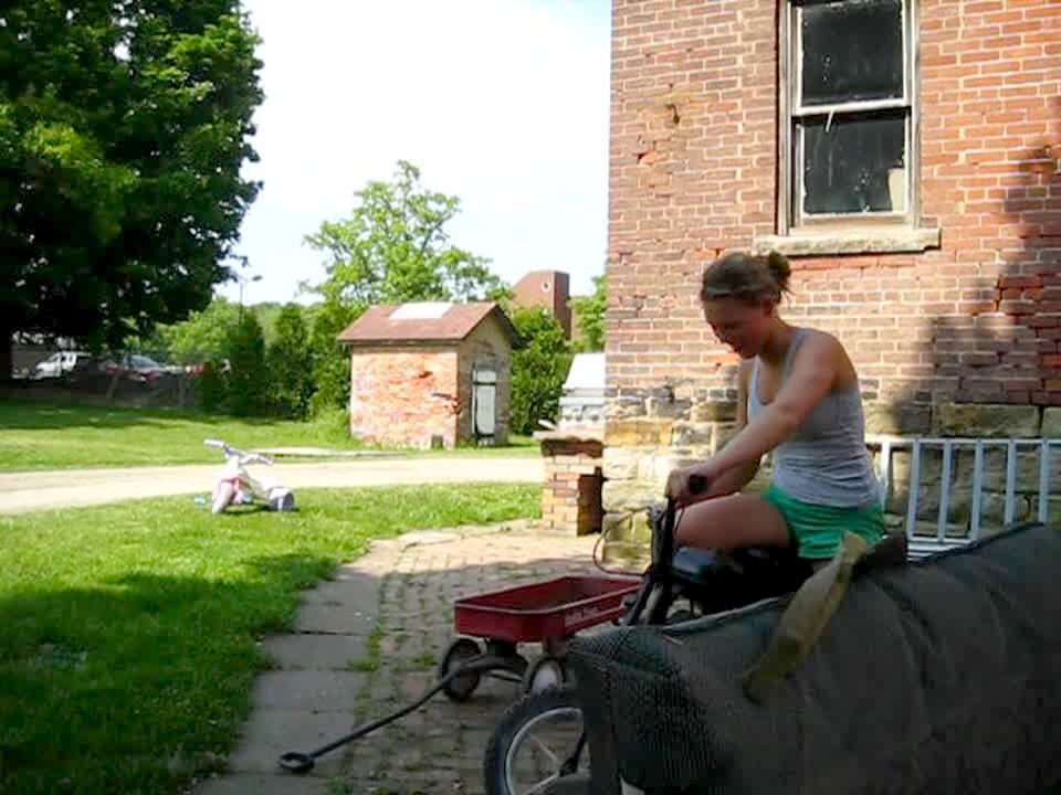 Teen girl tries to ride a cow. It just stands there. Boy twists cow's tail, causing it to buck. Girl gets thrown into a metal fence.