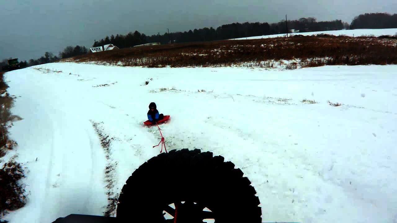 A boy walks inside a large pipe tube and it rolls down a track and it hits a hay bale at the end of the track and the boy falls. Featured talent cleared only (boy rolling the tire)