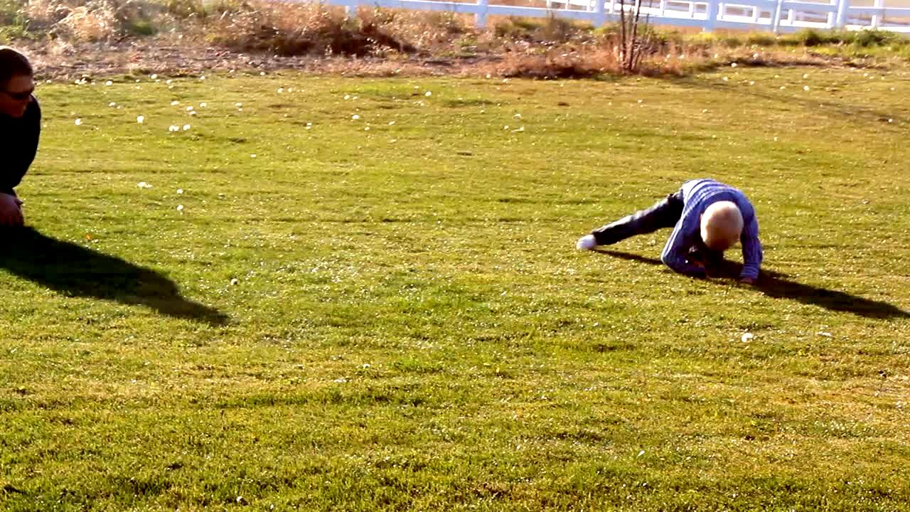 "Gusty Garbage Goof" A boy pushes a garbage can down a sidewalk on a windy day but the lid blows open repeatedly and hits him in the head. After a minute, it falls over and the boy struggles to pick it back up again before it knocks him over.