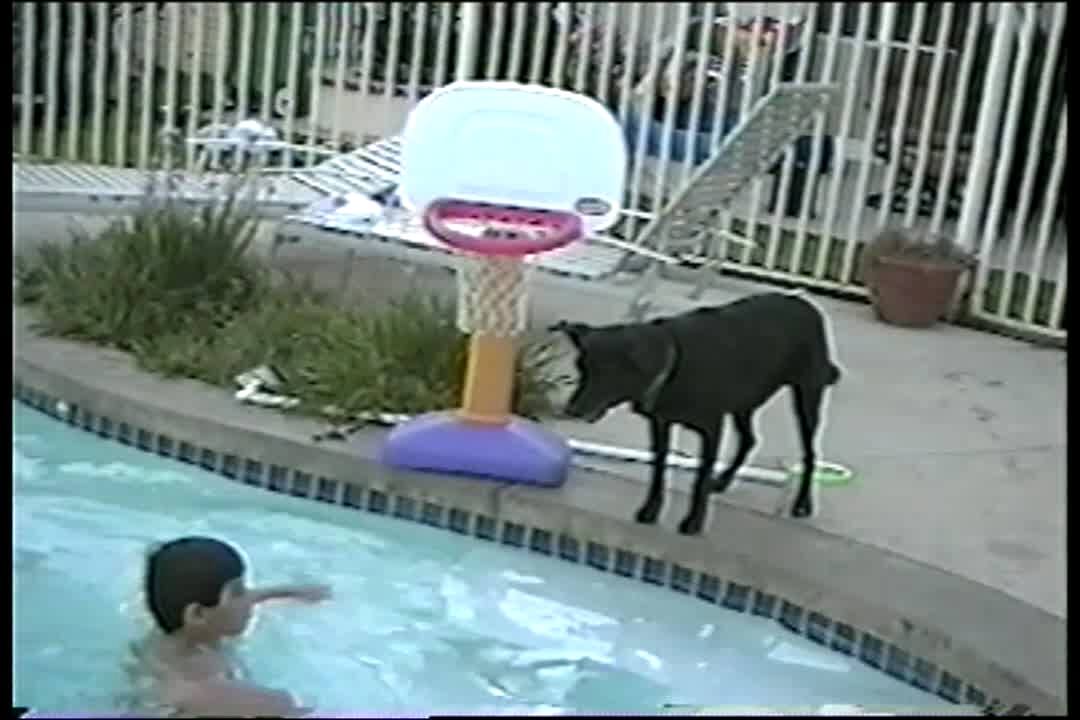 Dog repeately knocks a basketball into toy hoop by a swimming pool. AA: Pet Trick.