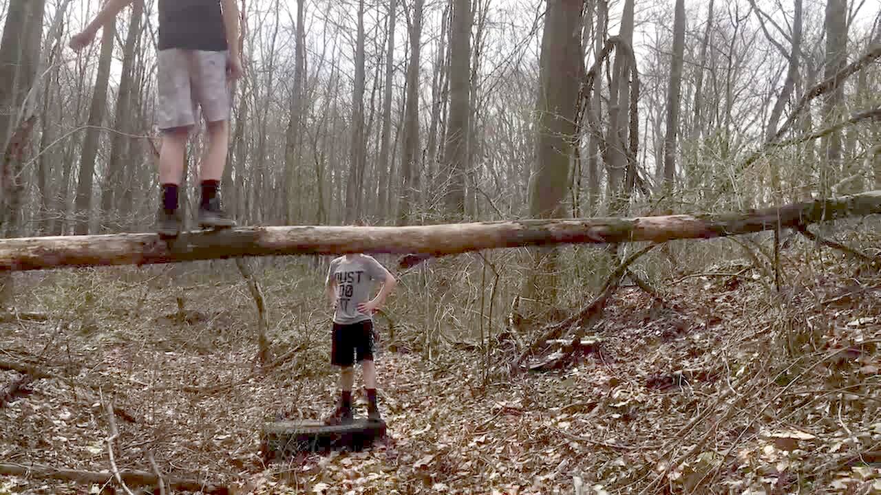 A Teen boy walks across a downed tree and it breaks and he lands on his groin.