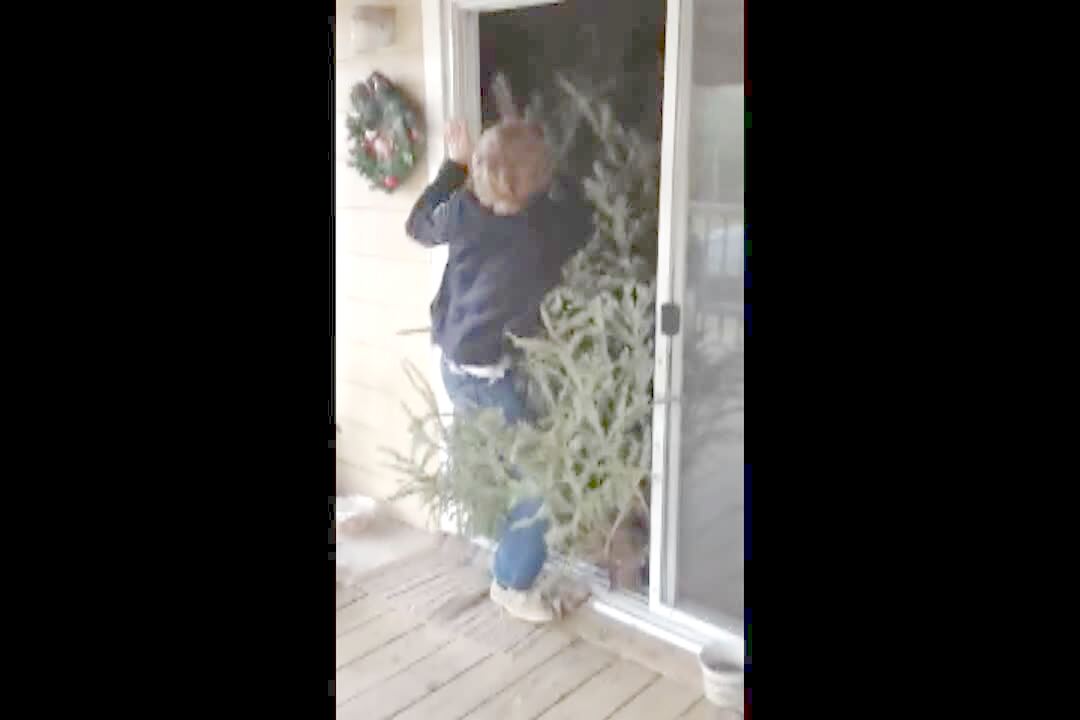 A teen boy is trying to pull a Christmas tree through a small sliding glass door. He jumps on it to get leverage and falls at 0:19.