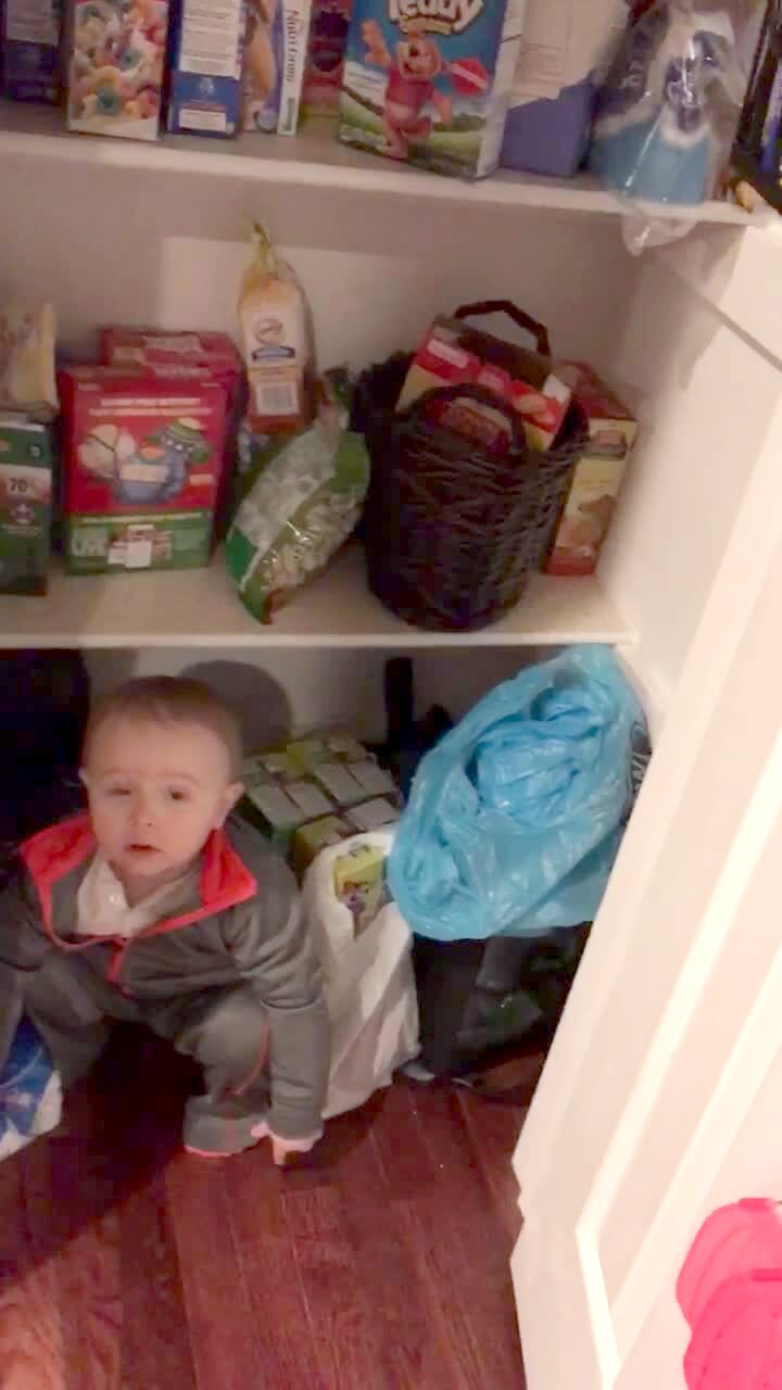 A tot boy thinks his stuffed animal toy went down the drain for the kitchen sink and yells into the drain to call it back. Then he says that he will go down the drain and bring the toy back. Right as the boy gets ready to go down the drain at 2:15, his dad lifts him up to show him that the toy is on top of the cupboard.