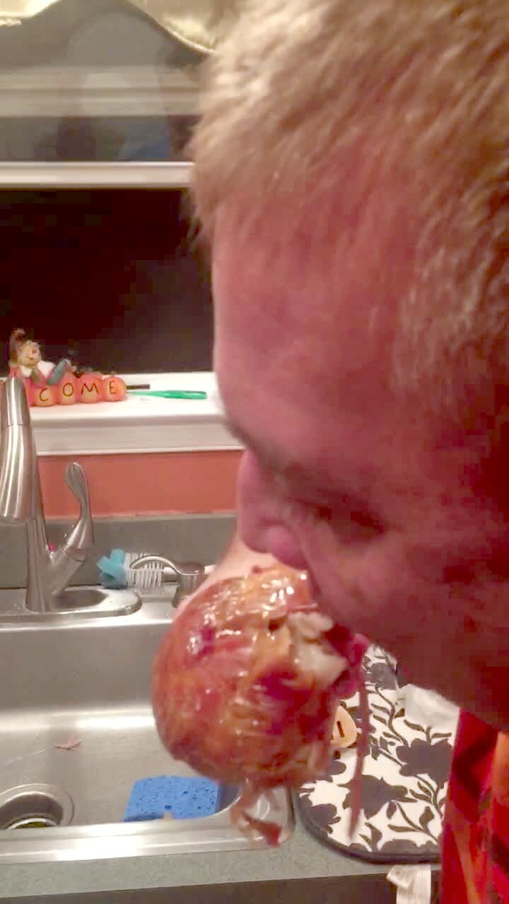 A man and woman pull on a string attached to a box hanging above them for their gender reveal. The box falls and hits the woman in the face and then hits her tot son in the face.