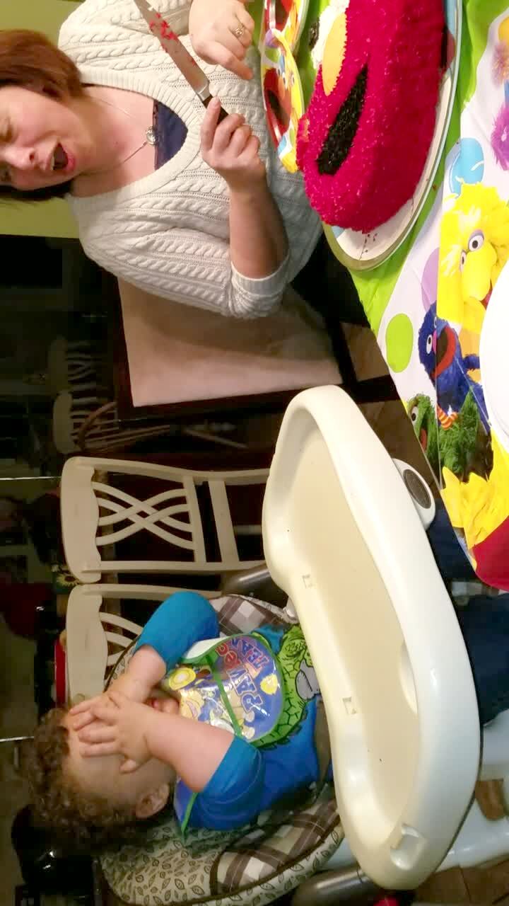 A tot boy screams and gets upset when his mom cuts a cake that looks like Elmo.