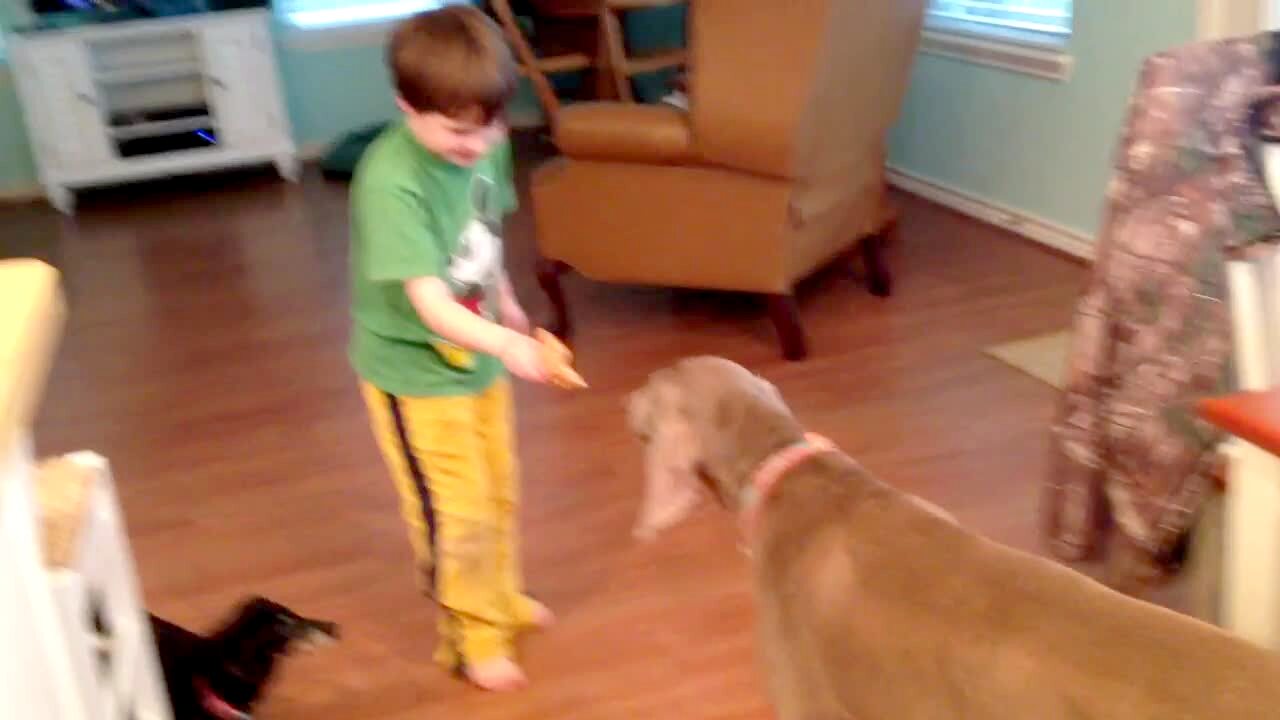 A dog puts its paw up when a man asks "who wants ice cream" in the kitchen.