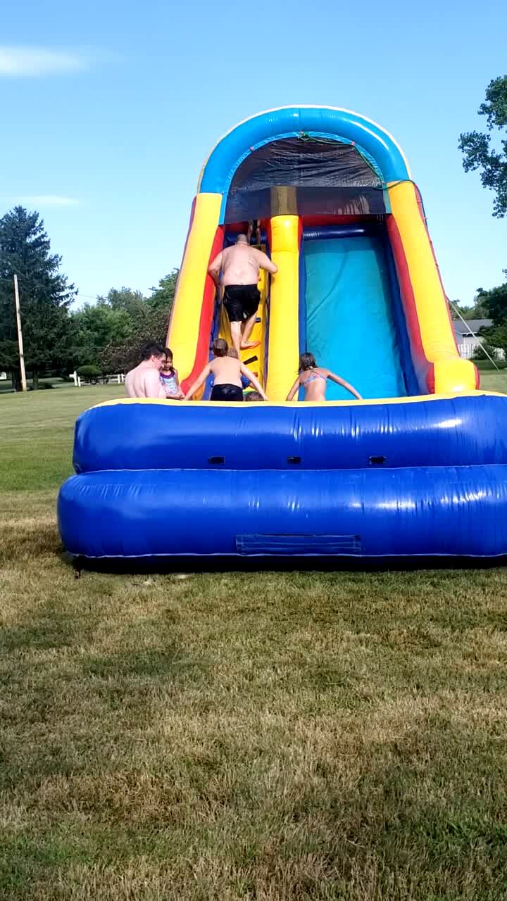 A dog barks and runs away from a man when he opens a door next to them as he wears an inflatable dinosaur costume.