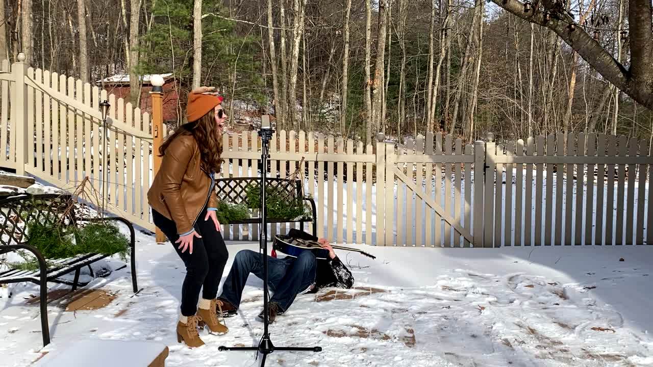 A woman smears peanut butter on cellophane wrapped around her head to distract her dog. While she clips her German Shepherd's nails the dog licks the peanut butter off her forehead.