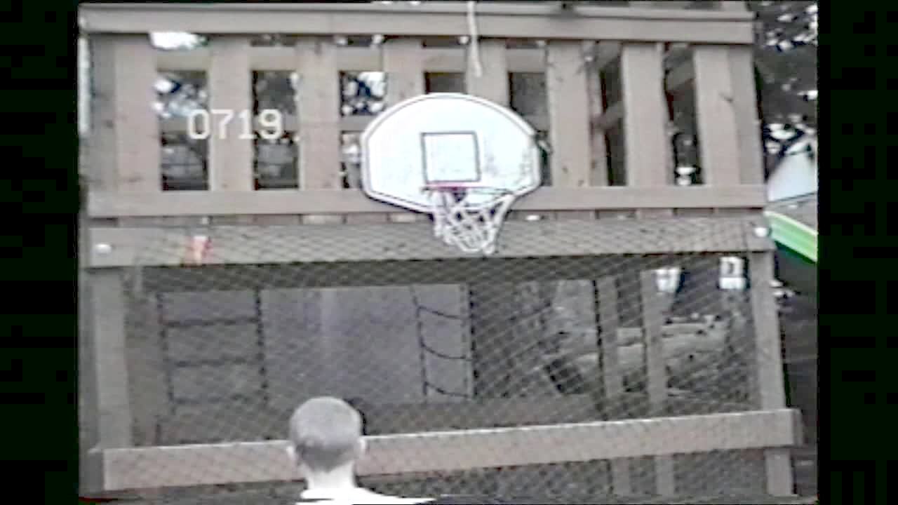 Cat at basketball hoop backboard helps kid make baskets - 7 in a row at one point