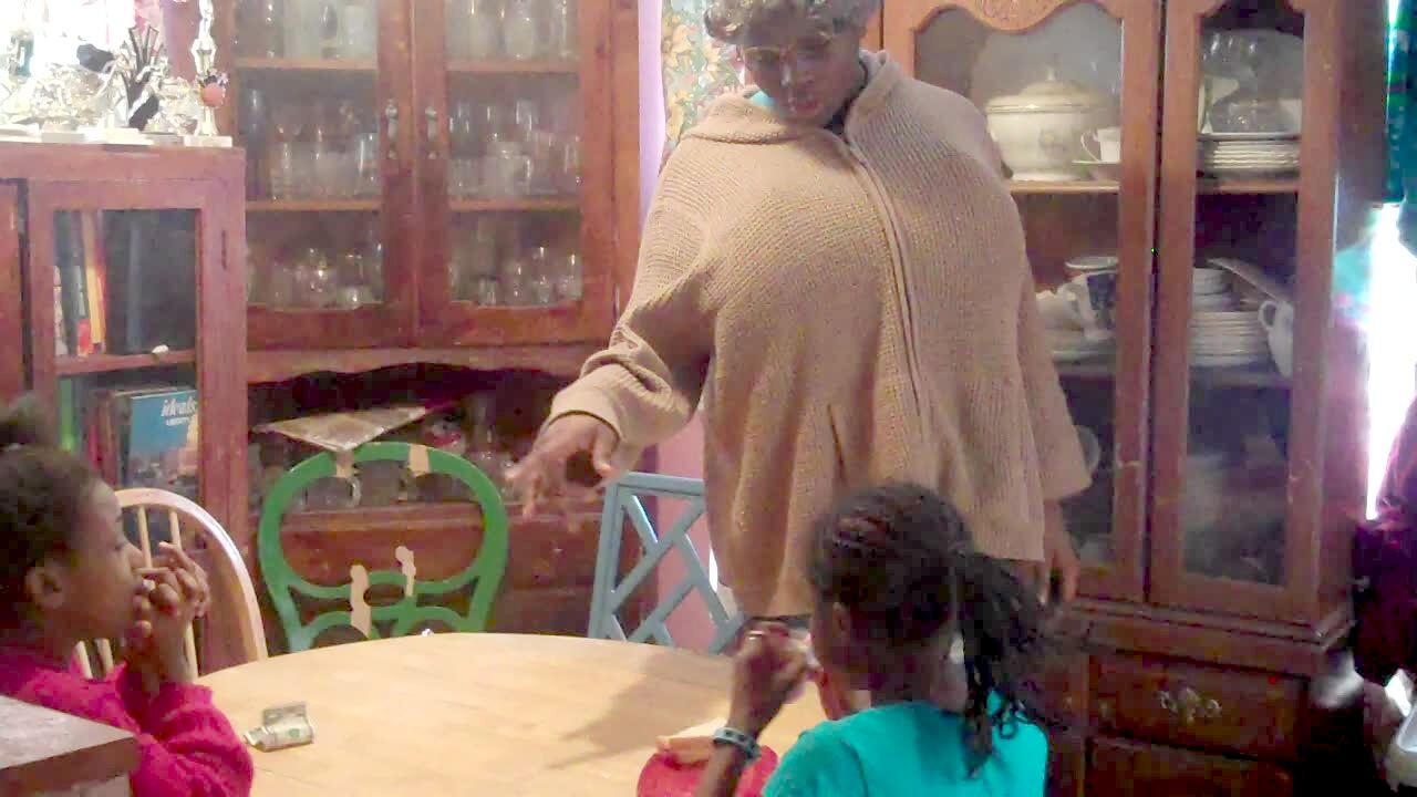 A man dressed like an old lady slams his hand on a table, and accidentally breaks the glass in a china cabinet behind him with his butt