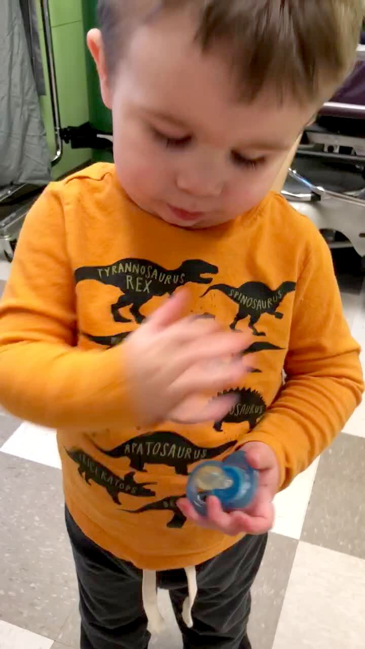 In a kitchen, a young boy wearing a plastic construction worker helmet tries to hit a toy plastic baseball off a tee with a toy bat. The camera woman tells him to keep his eye on the ball. The boy takes the ball off the tee and holds it up to his eye. .