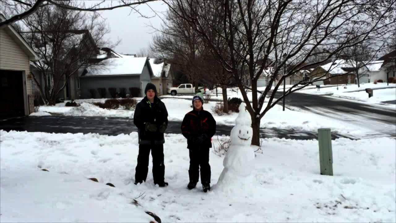 Two boys pose for a picture beside a snowman when one of them pushes the other one to fall against the snowman and knock it down. AA: Destroy a snowman.
