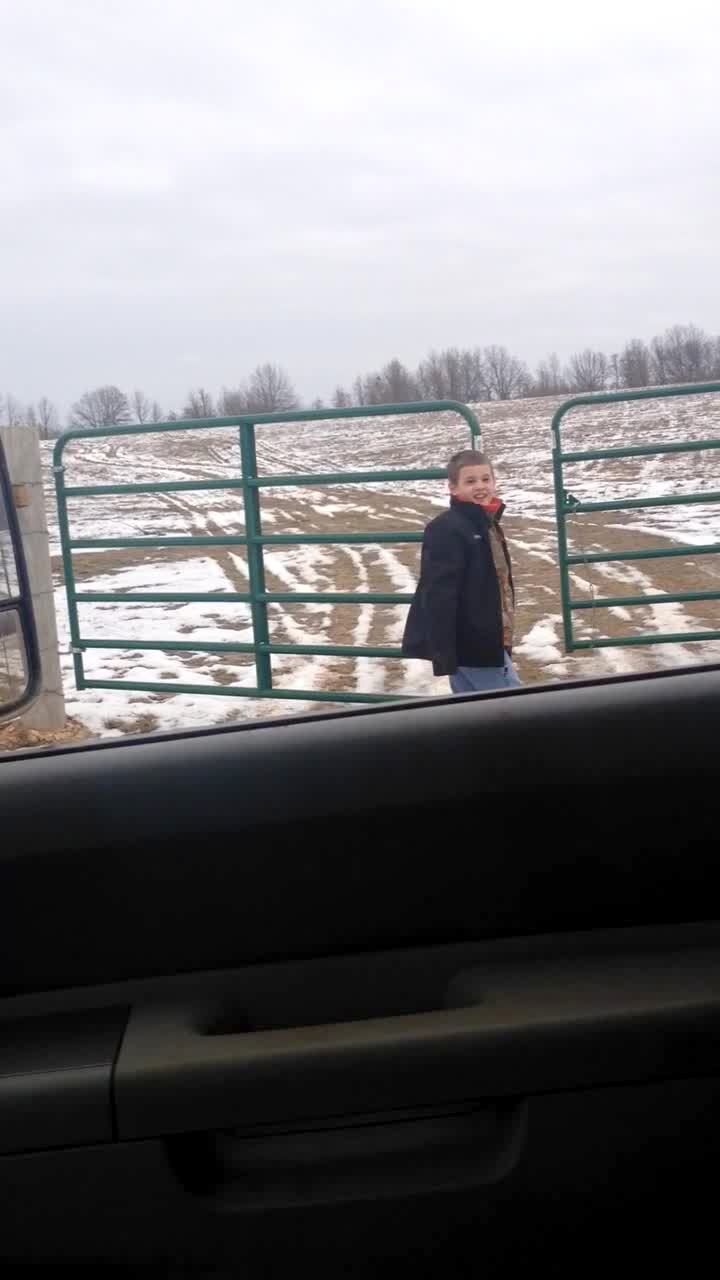 A boy runs back and forth to shut large gates outdoors. Each time he closes one and runs to get the other, the wind blows the first gate open again. After he trips and falls he eventually closes the gates.