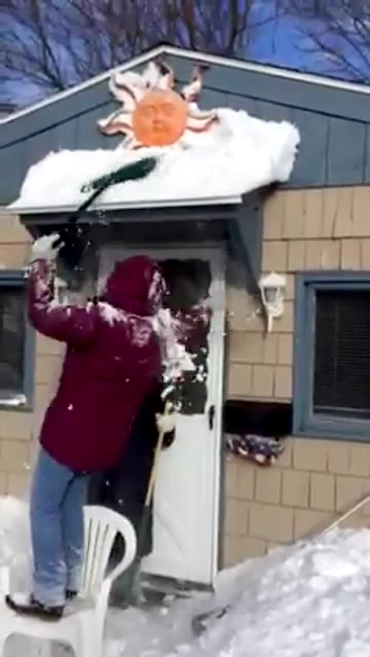A woman stands on a plastic chair and clears snow off her roof. As the loose snow falls over her, she slips off the chair, breaks it, and falls into a nearby snowbank.