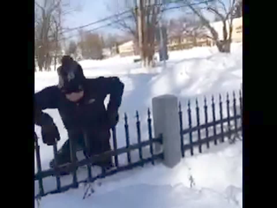 A young man tries jumping over a fence covered in snow and lands face first falling in deep. Short tail.