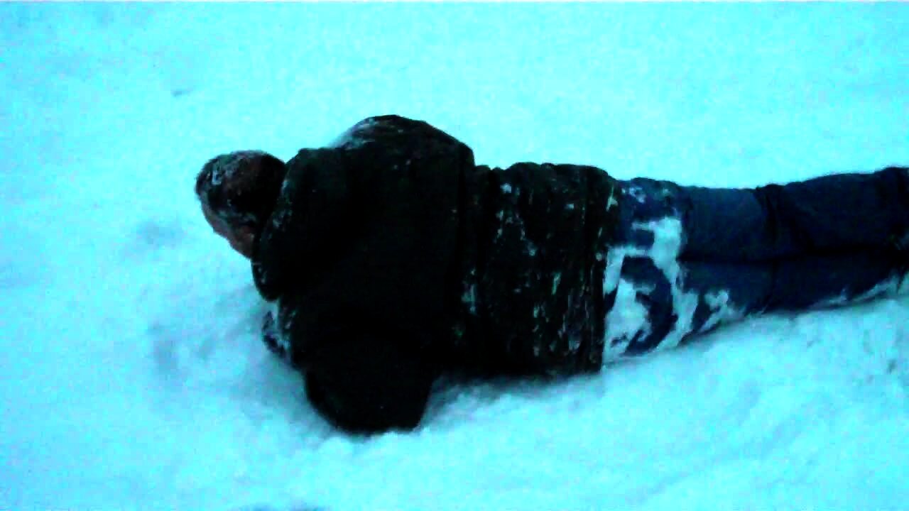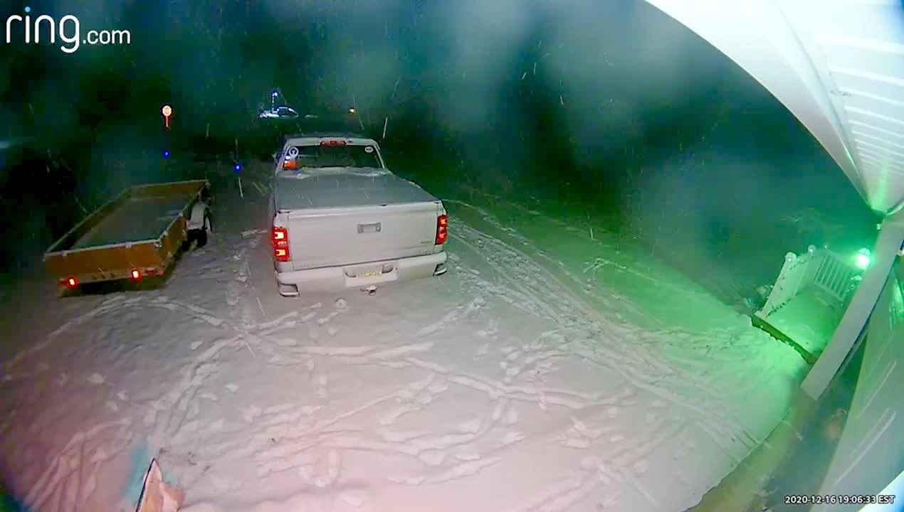 A man slips and falls on ice on a driveway, and throws his phone by mistake. Security footage.