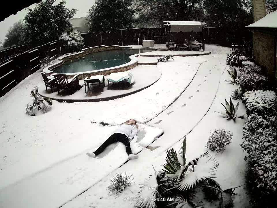 A teen girl slips and falls on her back on snowy walkway in backyard. Security footage.