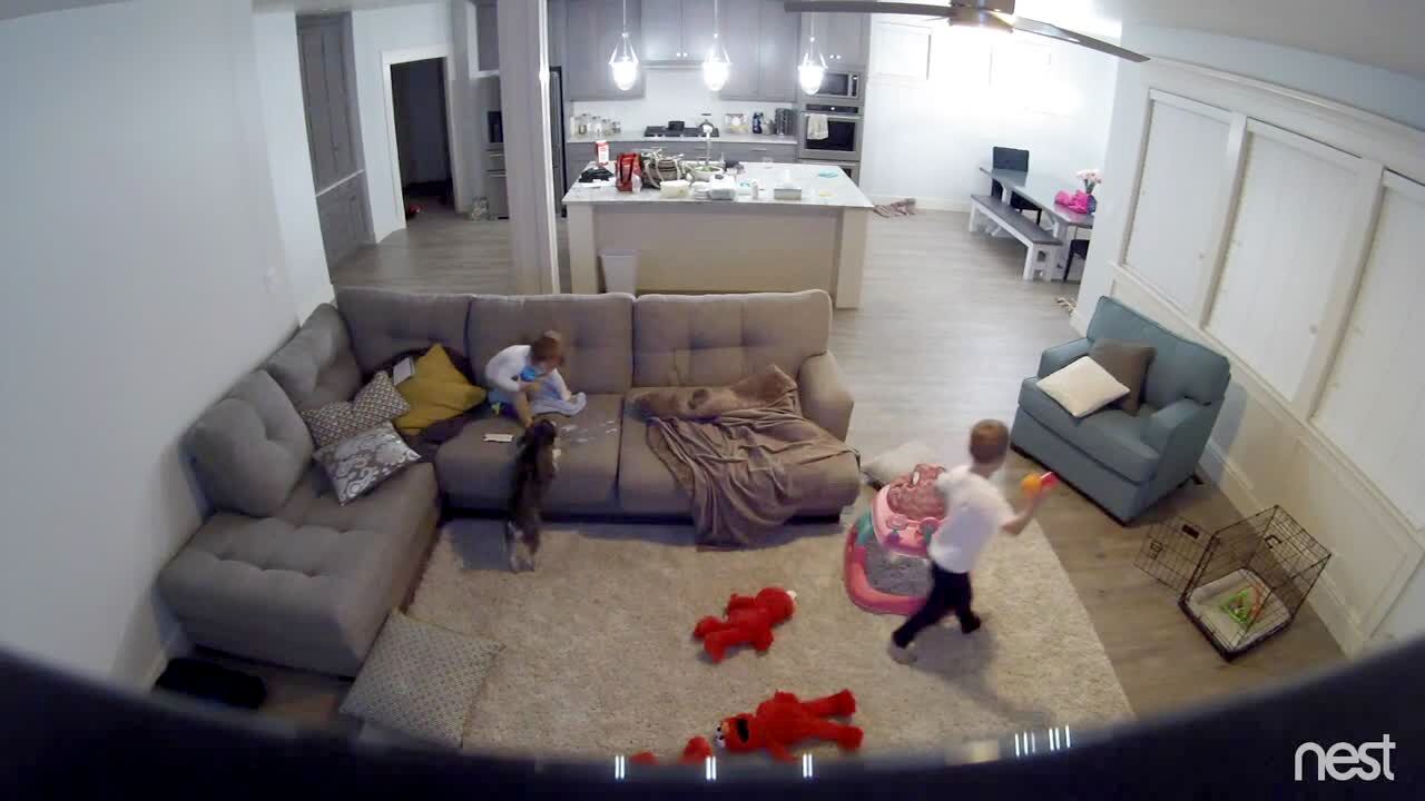 A tot boy runs away with his baby boy brother's pacifier in a house.